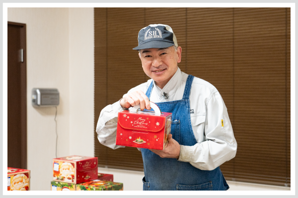 毎年クリスマスには、全社員にワンホールのケーキを贈呈。家族や仲間と楽しい時間を過ごせるようにしています。